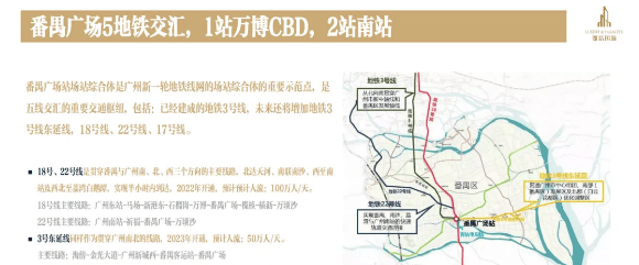 答:地铁 3 号线、18 号线、22 号线已通车运营,17 号线正在建设中,预计 2027 年建成通车;番禺广场地下空间及公园复建工程预计 2025 年底部分区域开放,2026 年全面竣工。