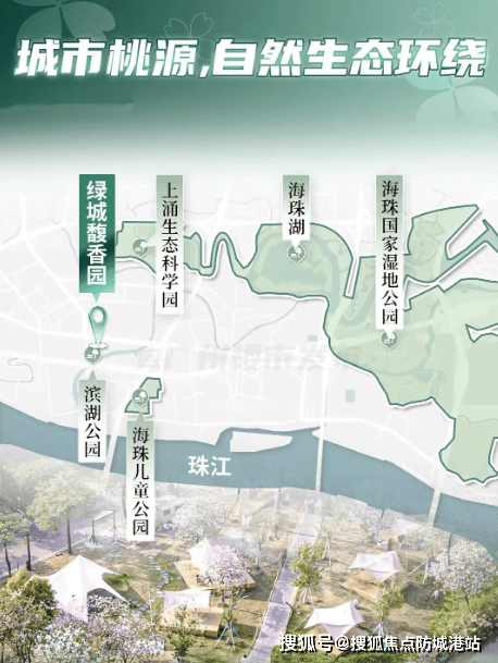 从外部来看,项目背靠河涌,打造了一个滨河公园,与周边的海珠儿童公园、海珠湖、海珠国家湿地等形成了巨大的天然生态背景板。海珠国家湿地是广州最大的城市湿地,被誉为“广州之肾”,植被覆盖率高,空气清新,是业主休闲散步、锻炼身体的好去处;海珠儿童公园适合带孩子游玩,让孩子在大自然中快乐成长;海珠湖风景优美,湖面开阔,是休闲放松、欣赏风景的绝佳场所。