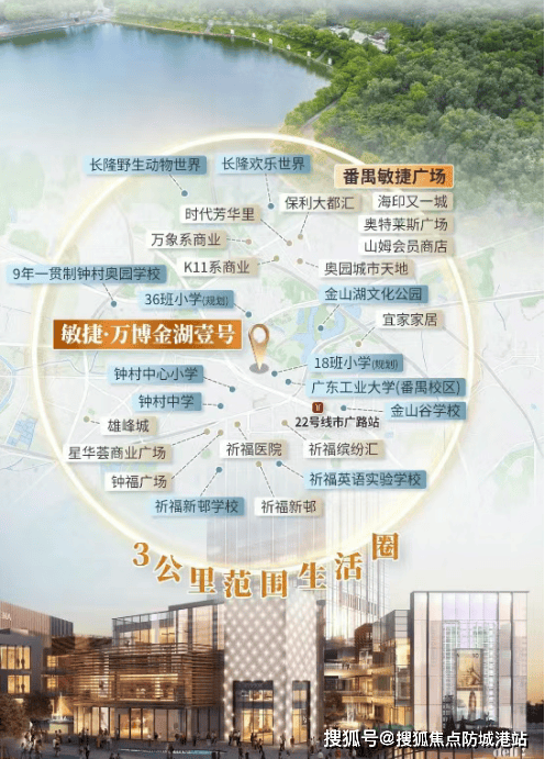 『敏捷·万博金湖壹号』位于广州市番禺区市广路与金山大道交汇处,紧邻金山湖文化公园,距离22号线市广路站仅约500米。便捷的交通网络使得居民能够轻松抵达广州南站,并通过地铁快速连接至珠江新城等核心区域。此外,项目周边汇聚了超过2.8万家企业,包括希音、广汽埃安等独角兽企业,形成了浓厚的商业氛围。这种独特的地理位置不仅提供了丰富的就业机会,也方便了日常生活中的购物、休闲等活动。