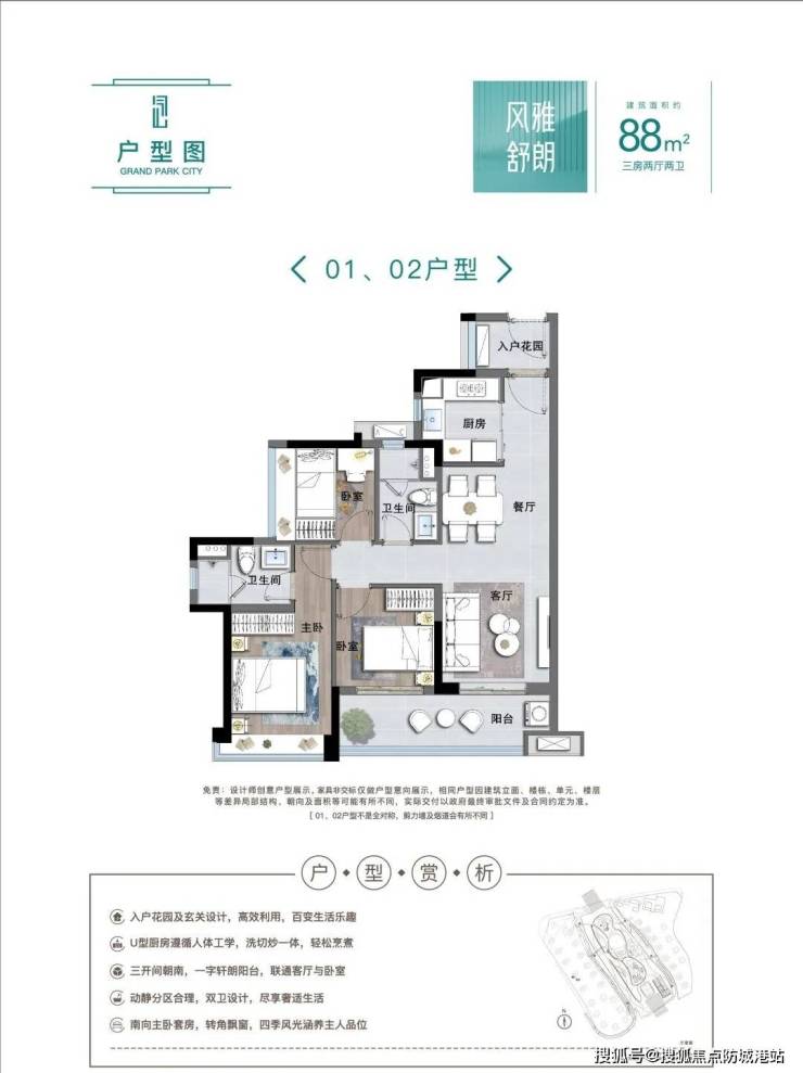 建面约80㎡三房,带入户花园,三个卧室都带飘窗,增强实用性。
