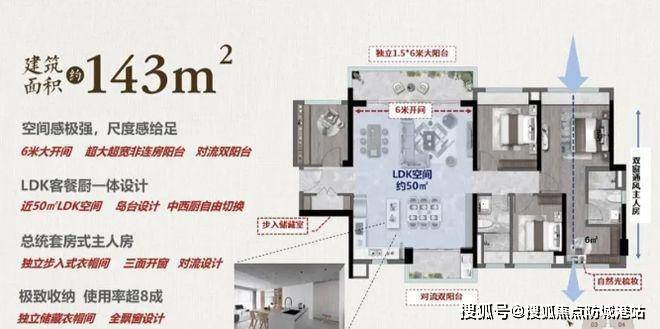 143㎡奢级产品:该户型有着超高的使用率,LDK 空间宽敞舒适。玄关首创步入式储藏室,收纳功能强大。6 米大开间非连房阳台搭配双对流生活阳台,不仅通风采光极佳,还带来奢级的空间享受。主人房自带独立衣帽间,并且拥有三窗设计,尺度感十足,为居住者带来超舒适的体验。