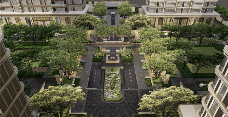 景观园林方面,项目精心打造了约330米的园林中轴,这条中轴贯穿南北两个地块,形成了“一轴双园”的宏大格局。园林设计汲取了中式对称美学的精髓,同时融入现代景观手法,营造出既有东方尊崇韵味,又符合现代审美的高品质居住环境。漫步其中,移步异景,亭台楼阁与花草树木相映成趣,为业主提供了一处远离城市喧嚣的静谧天地。无论是晨跑锻炼,还是饭后散步,这里都是理想的场所。