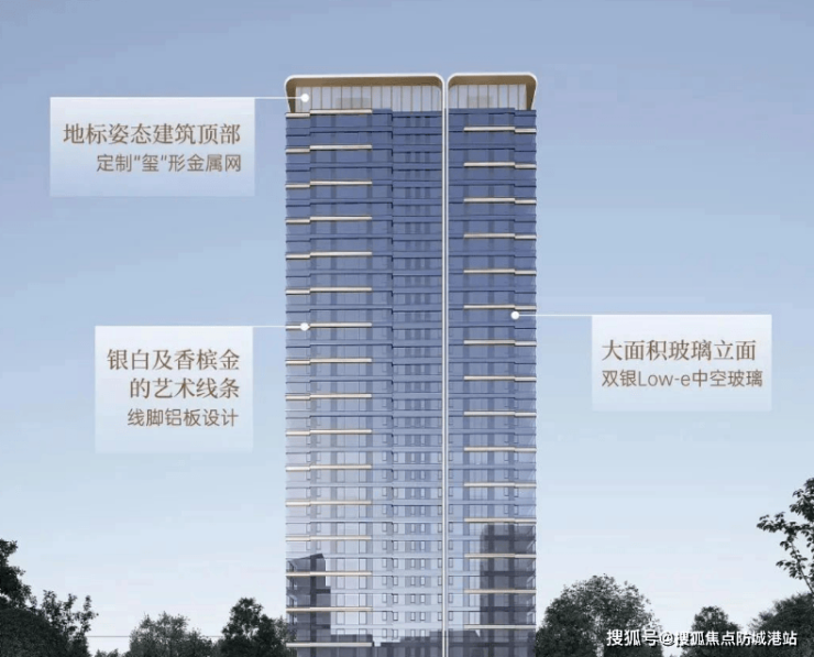 外立面设计:大面积玻璃幕墙+铝板及奢石堆砌,塔冠定制玺型符号,辅以银白和香槟色艺术线条装饰,彰显贵气与典雅的艺术张力。