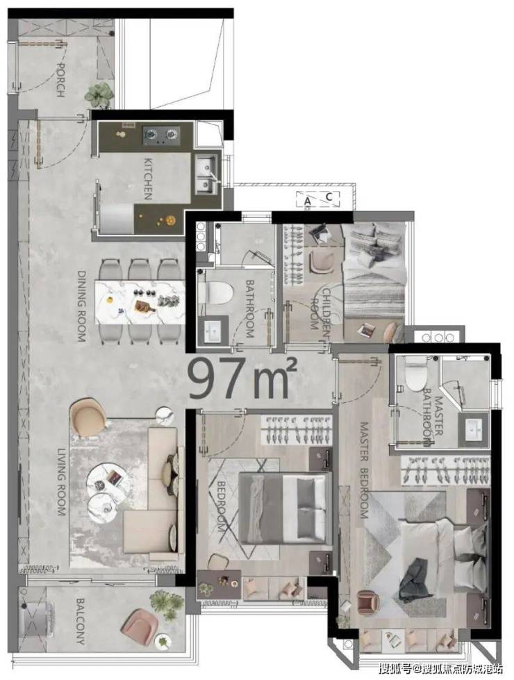 最受刚需家庭关注的是 97㎡的三房两厅两卫,总价约 360-380 万元,单价 3.8 万 / 平起。