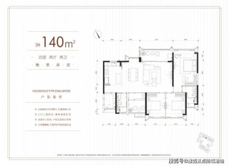 另外还有 140㎡的四房户型,采用横厅设计,南北对流,北向主阳台望公园