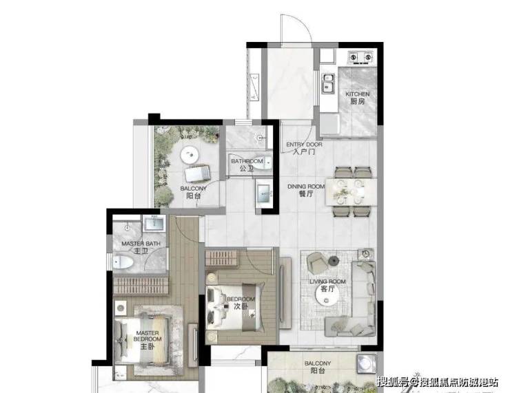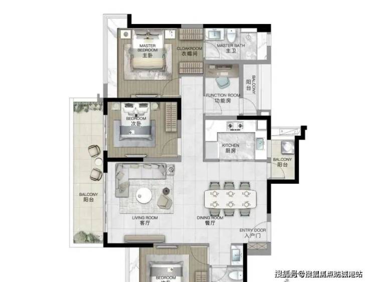 125平四房则采用横厅设计,南向阳台提供了充足的景观和采光面。