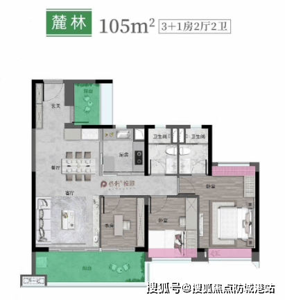 105㎡三+一房两卫,约9㎡入户区域,灵活收纳空间