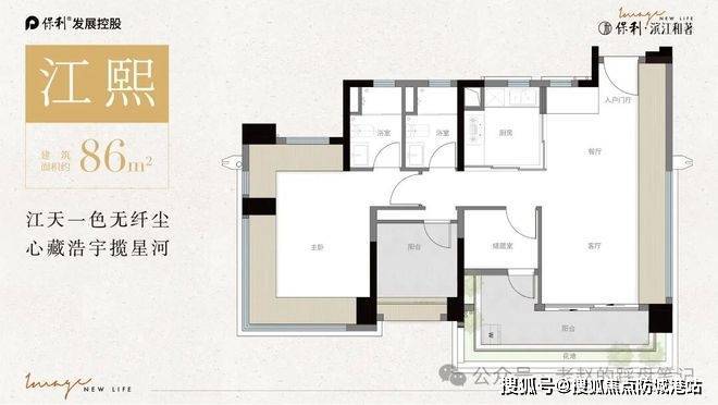 约86平方米三房户型定位高性价比改善首选。客餐厅一体化布局形成开阔公共空间,南向大阳台面宽约6.4米,采光面充分展开。主卧配备L型飘窗,兼具观景与收纳功能。可变空间预留灵活布局可能,满足书房、儿童房或多功能区需求。