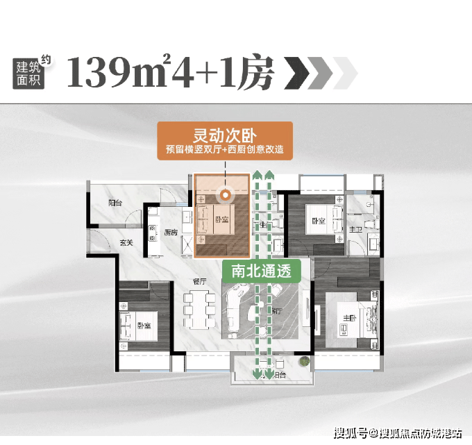 建面约139㎡ 4+1房两厅两卫:多代同堂家庭的一步到位之选。此户型为稀缺的边厅设计,南北通透,三面采光。约7米宽厅连接约5.7米阔景阳台,形成超过46平方米的豪宅级社交空间。U型厨房搭配灵动次卧,为未来改造横竖双厅或西厨空间预留了无限可能。约28平方米的豪华主卧套房,配备步入式衣帽间与明卫,拥有270°观景视野,将居住舒适度推向顶峰。