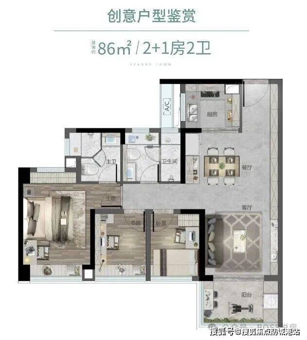 该户型为刚需首选,设计紧凑实用,全南向布局,三卧室朝南,拥有超11米景观线,采光和通风效果极佳。全屋高赠送,使用率超90%,极大提升了空间的实用性。户型注重收纳设计,储物空间充足,相当于50辆宾利车尾箱的收纳容量,可满足业主的日常收纳需求。主卧采用双采光通风设计,提升了居住的舒适度;客厅连接景观阳台,拓展了活动空间,同时让室内视野更加开阔。