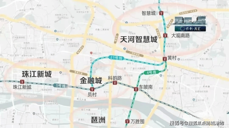 项目所处板块承接天河智慧城与金融城的外溢红利 周边产业集聚 就业人口持续导入 对居住需求形成坚实支撑 轨道交通方面 距离地铁21号线大观南路站约1.2公里 步行约20分钟 一站换乘4号线可达金融城 琶洲 四站至员村换乘5号线直抵珠江新城 整体通勤时间可控制在1小时以内 自驾出行更为高效 周边有广深高速 广园快线 大观路以及机场第二高速(在建) 约40分钟内可覆盖珠江新城 琶洲 越秀等核心区域 对于在珠金琶工作的高净值人群 该区位在时