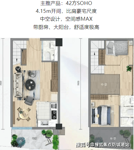 舒适度:中空设计,空间感MAX,带厨房、大阳台,舒适度极高。