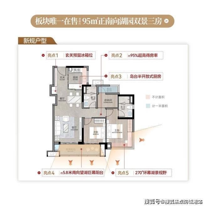 说到户型,项目这次推出的新规设计确实很用心。**95㎡的三房**和**117㎡的四房**,是目前最受关注的两种产品。95㎡的三房使用率很高,接近95%,空间利用率极致。进门玄关位置预留了嵌入式冰箱位,这个小细节解决了很多家庭的收纳痛点。客厅连接约5.8米宽的景观阳台,视野开阔,采光极好。厨房采用半开放岛台设计,推拉门一拉就能变开放式,既方便家人互动,又能一边做饭一边欣赏湖景。主卧面积超过21㎡,配270°环幕落地窗和飘台,实际使用空间轻松容纳大床、双床头柜和步入式衣柜,居住感完全不输更大的户型。