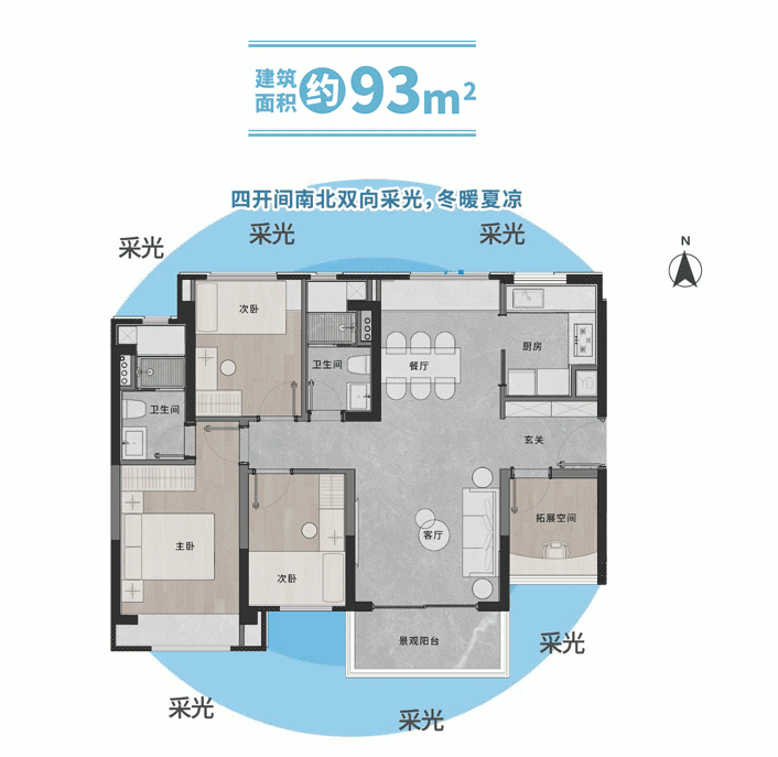 83/93㎡的3+1房:适用于三口之家,拥有足够的私密性和舒适性。