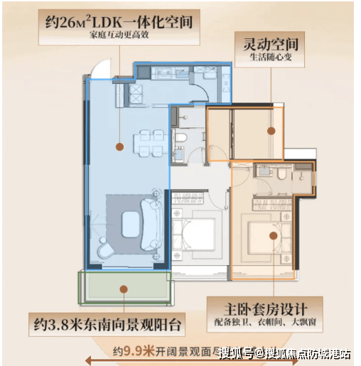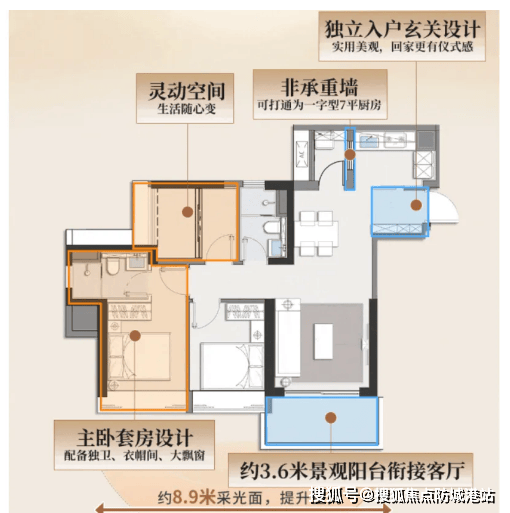 该户型采用少承重墙化设计,次卧可根据需求灵活打通或隔开,生活阳台也能与厨房打通,打造出 7 平全明空间,提升空间利用率。主卧配备独立卫浴,增加居住私密性,避免家人之间使用厕所的冲突,要知道,市面很多产品需超 90 平才会配置主套设计,87 平户型的这一配置极具竞争力。