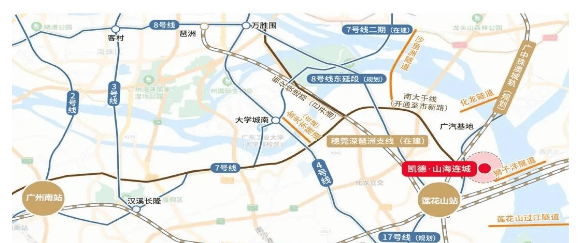 项目位于番禺莲花湾核心,交通优势持续升级。已通车的佛莞城轨莲花站距项目仅 1 公里,3 站直达万博、4 站到广州南站;穗莞深城轨琶洲支线 2 站到大学城、3 站到琶洲,未来广中珠澳城轨还将直达中山、珠海、澳门。地铁方面,8 号线东延段(2024 年动工,2027 年开通)7 站到琶洲,17 号线规划中,双地铁将进一步打通通勤脉络。自驾可通过南沙港快速、广澳高速等主干道,30 分钟达番禺广场、45 分钟到珠江新城,大湾区跨城出行高效便捷。