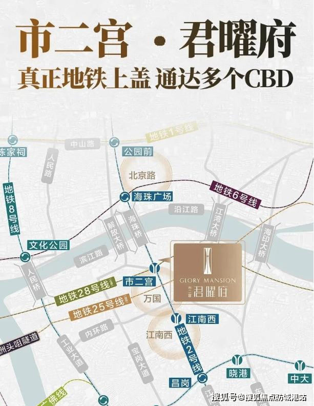 君曜府位于地铁2号线与28号线(广佛段在建)交汇点市二宫站上盖,便捷连通北京路、万国、江南西等多个商圈,快速到达珠江新城、琶洲等CBD。未来28号线开通后,从市二宫站出发,仅需三站即可抵达琶洲,快速通达广佛莞三市中心城区。此外,周边主干道如江南大道、内环路、滨江路等环绕,家门口设有超过20条日夜班公交线路,自驾出行也极为便利。