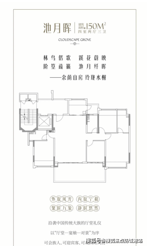 主力户型与装修方面,项目主推建面约150-175㎡院墅级四房,部分顶层复式户型最大建面可达300㎡,所有户型均经专业设计,兼顾实用性与舒适性,梯户比、得房率均处于行业领先水平,装修标准采用高端品牌配置,全方位满足高净值家庭的居住需求。具体户型详情如下:建面约150㎡四房两厅两卫,梯户比为三梯三户,每户拥有独立电梯厅,南北双面采光,全明户型,动线流畅,得房率约130%,阳台面宽达8米、进深约2.4-3米,可打造专属“空中小院”,满足业主养花、种草、休闲观景等多元需求,户型布局合理,客厅奢阔通透,卧室采光充足,主卧配备独立卫生间与衣帽间,兼顾私密性与舒适性,适合三口之家或三代同堂居住;建面约175㎡四房两厅三卫,梯户比为专梯专户,得房率约135%,分为标准层、底层与顶层复式三种户型,其中底层房源赠送前后双花园+地下室,实现使用面积最大化,顶层复式为双层空间,私享空中露台,标准层为南北通透大平层,阳台面宽达8.5米,进深约3米,“空中小院”空间更大,可打造私人花园、休闲茶室等,客厅采用横厅设计,奢阔大气,主卧配备独立卫浴、衣帽间与观景飘窗,次卧均为南向,采光通风极佳,适合追求高品质生活的高净值家庭;顶层复式户型(最大约300㎡),得房率高达250-300%,双层空间设计,一层主打社交与休闲,二层主打居住与私密,私享超大空中露台,可打造空中花园、烧烤区、观景台等,满足业主的高端居住需求,是整个项目中最稀缺的户型,仅少量房源可售。
