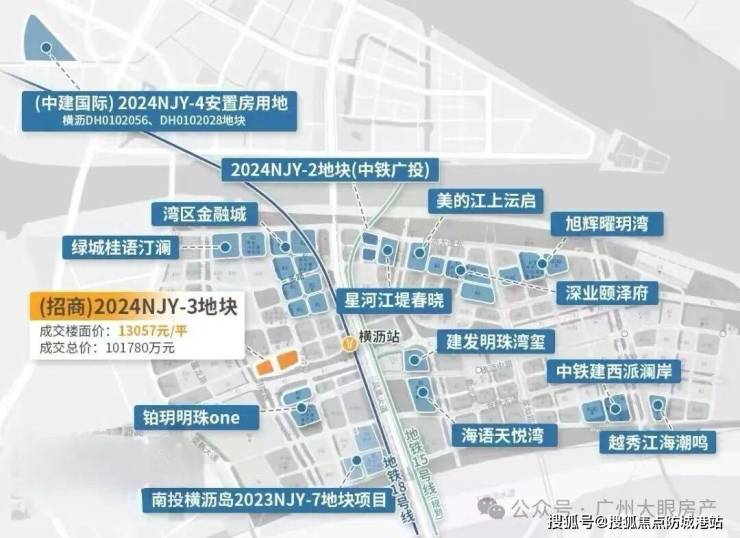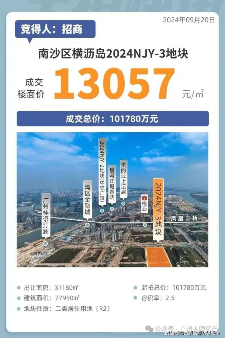 2024年9月20日,广州招盛房地产有限责任公司(招商蛇口)以底价10.18亿元拿下横沥岛2024NJY-3地块,扣除456㎡配建后,成交楼面价约1.3万/㎡。