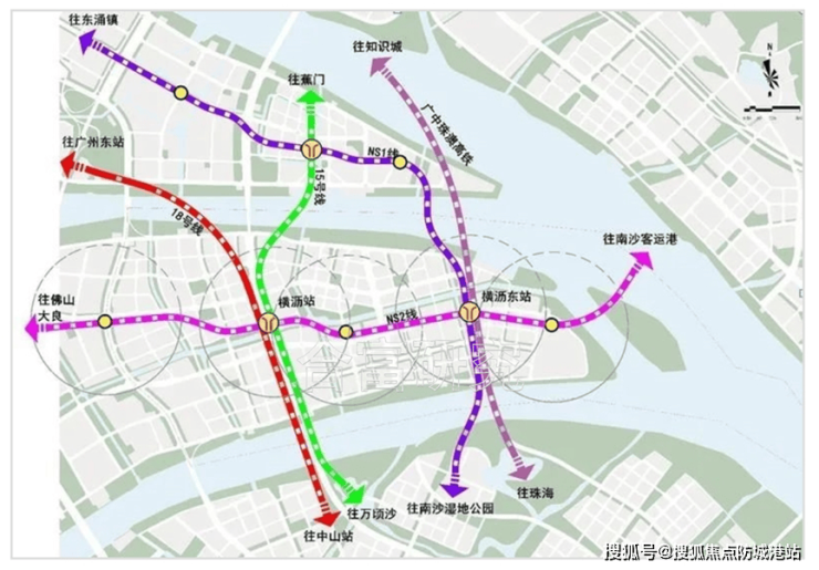 项目距离地铁18号线横沥站约400米不到,横沥岛规划地铁 18 号线、广中珠澳高铁、地铁 NS2 线、地铁 15 号线、 地铁 NS1 线。其中,横沥站为 18 号线、15 号线、NS2 线三线换乘中心,横沥东站为 广中珠澳高铁、NS1 线、NS2 线三线换乘中心。