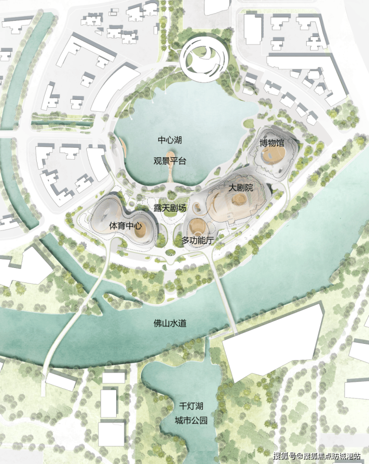 建发·灯湖缦云南侧隔河相望为规划中的“南海之眼”文化艺术中心,该项目占地约5.9万平方米,包含大剧院、博物馆与体育运动中心,一期计划于2024年动工,2029年建成投用。建成后,居民步行过桥即可参与文化演出、展览及健身活动,形成“住—文—体”一体化生活圈。