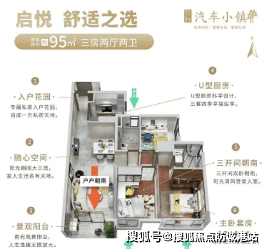 95㎡三房两厅两卫:南向布局,三开间朝南,主卧带飘窗,得房率超80%;