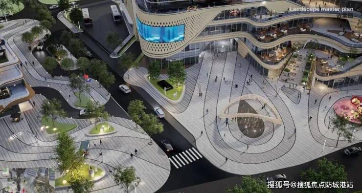 有雕塑、水幕墙等景观,旋动的帆形雕塑折射光影,约 23 米长优雅弧面的水幕墙,以不同规格与弧度的中国黑石材交叠铺贴。