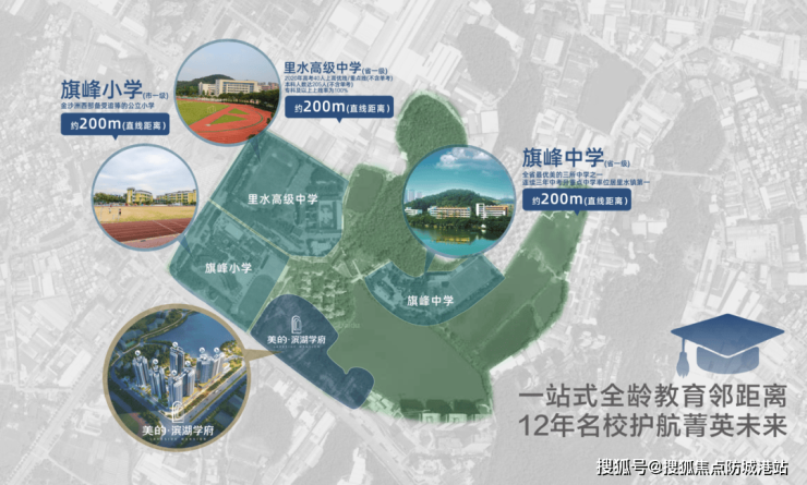 教育是项目核心优势之一。以200米为半径,旗峰小学(市一级)、旗峰中学(省一级,“全省最优美的三所中学之一”)、里水高级中学(省一级高中)三所优质学府环伺,构建“目送式”12年教育闭环。未来三年,片区还将投入6.2亿元新增1.2万个学位,教育资源持续升级。商业方面,家门口即24万㎡嘉洲广场,15分钟车程内覆盖永旺梦乐城、金沙洲万达、金铂天地、永润广场等大型综合体,商业体量超10个天河城,且均已成熟运营,无需等待。医疗资源依托金沙洲及里水片区完善体系,满足日常健康需求。