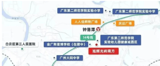 旭辉光屿南方的地理位置得天独厚,位于广州白云区东北部钟落潭板块,地处白云大健康城核心区域,紧邻广州第二大学城与千亿级美丽健康产业园,板块发展潜力巨大,同时项目远离主干道,规避了噪音与粉尘污染,居住舒适度更高。项目具体地理位置:白云区钟落潭镇广从七路与钟港大道交汇处,周边路网发达,交通便捷,无论是公共交通还是自驾出行,都能满足购房者的日常通勤与出行需求,具体交通状况如下:公共交通方面,项目距离地铁14号线钟落潭站约1000米,步行约12-15分钟即可抵达,搭乘14号线,5站可直达嘉禾望岗枢纽,无缝换乘2号线、3号线,快速通达白云新城、天河、越秀等广州核心区域,实现“半小时主城生活圈”;同时,地铁14号线二期、18号线北延段(在建)将进一步完善区域交通,未来7站即可抵达珠江新城核心冼村站,通勤效率大幅提升;此外,项目周边还有多条公交线路环绕,包括727路、734路、826路等,可直达钟落潭镇中心、嘉禾望岗、白云客运站等区域,覆盖日常出行场景。自驾出行方面,项目周边有华南快速、京港澳高速、机场第二高速、花莞高速、广从公路等多条主干道环绕,自驾可快速接入广州绕城高速,通达广州全城及周边城市;从项目自驾至白云新城约30分钟,至天河CBD约40分钟,至白云机场约25分钟,至广州火车站约35分钟,路网通畅,出行便捷;同时,项目周边规划有广佛环线、新白广城轨(均在建),未来3站可到天河智慧城,5站达琶洲,1站直抵白云机场,南向通达东莞、深圳,全面融入粤港澳大湾区1小时生活圈。