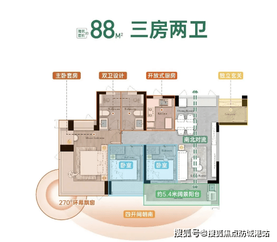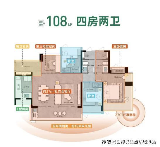 项目主推 88-108㎡三至四房,均为科学城首个全面采用建筑新规的户型,使用率接近 100%,空间利用率远超板块现有产品。户型设计聚焦实用性与舒适性:88㎡三房两卫做到南向三开间,主卧带独立卫浴与飘窗,客餐厅一体化拓展活动空间;98㎡四房两卫打造 LDKB 大方厅,预留家政间与储物空间,满足多人口家庭需求;108㎡四房两卫为南北对流格局,配备超 6 米景观阳台,双次卧空间均超 10㎡,可轻松摆放 1.8 米大床,兼顾功能性与居住舒适度,花更少预算即可享受更高品质生活。