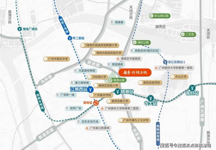 项目雄踞海珠老城区核心腹地,南侧与晓港公园仅一路之隔,漫步园内,绿树成荫,繁花似锦,是休闲漫步、放松身心的绝佳去处;北侧对望二沙岛,与滨江东豪宅区相邻,浸润在高端居住氛围之中;西侧是江南西、太古仓等繁华商圈,购物、娱乐、餐饮等多元业态一应俱全,满足您对品质生活的所有想象。同时,项目紧邻越秀、天河核心区域,与珠江新城直线距离仅 4km,城市核心资源触手可及,让您在繁华与宁静之间自由切换,尽享都市生活的便捷与精彩。如此得天独厚的地段,错过不再,速拨 400-655-7089,了解更多详情。