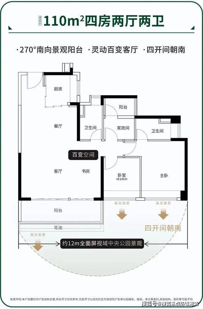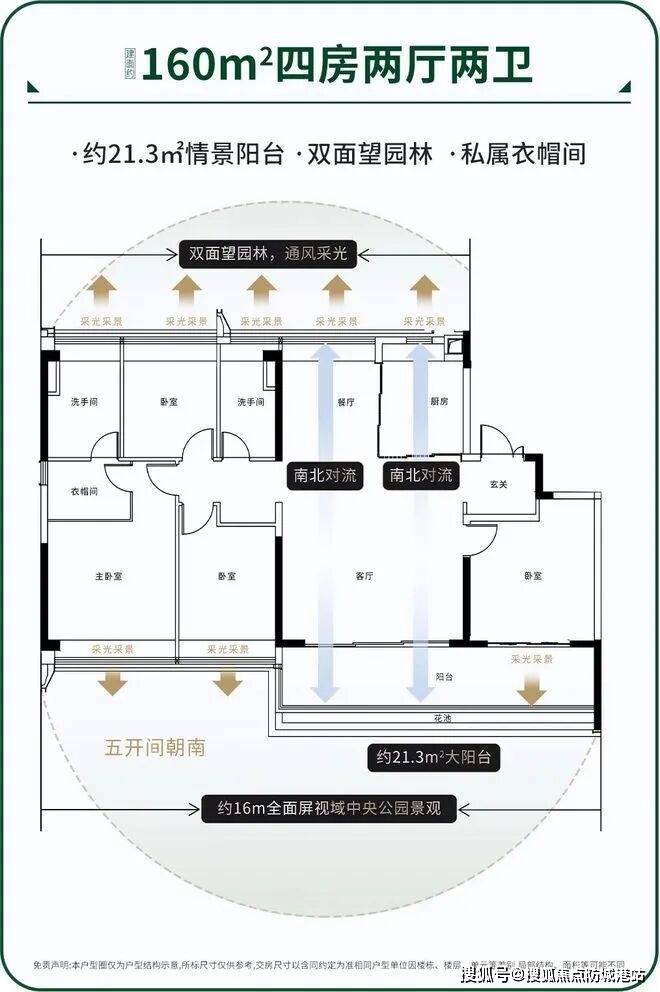 视野无遮挡,全楼栋平权设计,居住舒适度高。南向四开间布局,客厅、主卧、两个次卧均朝南,实测阳光覆盖率达 95%;奢阔主套面积 20㎡,配备独立卫浴与步入式衣帽间,提升居住品质;客餐厨一体化设计,活动空间达 40㎡,预留强收纳空间(玄关柜、阳台储物柜等),满足家庭储物需求;6.2 米景观阳台,宽度 1.8 米,可观赏园林景致。得房率 103.2%,适配三口之家向多人口家庭过渡的改善需求。