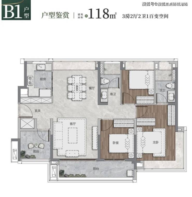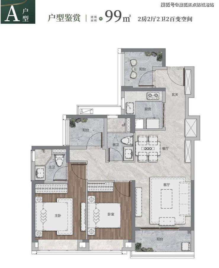 本户型最大的亮点在于,在99平的面积段做到了2+2房,且还是主套设计,空间利用率颇高,刚需也可以实现4房梦。