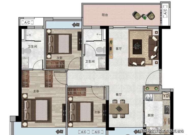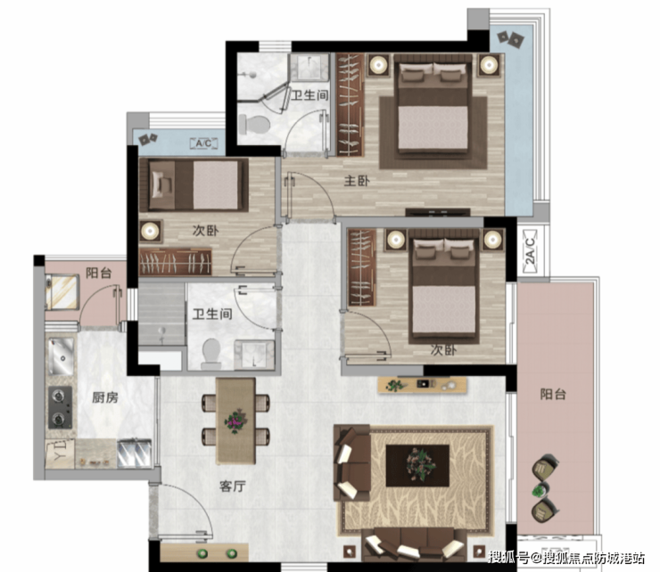 约 126 - 138㎡户型:南北通透,双阳台设计,主卧约 270° 转角飘窗,南向约 6 米大阳台,居住体验舒适。