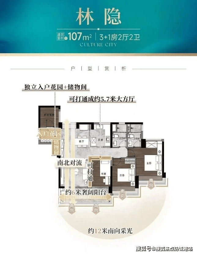 107㎡四房:12米南向采光面,6米阳台+独立入户花园;