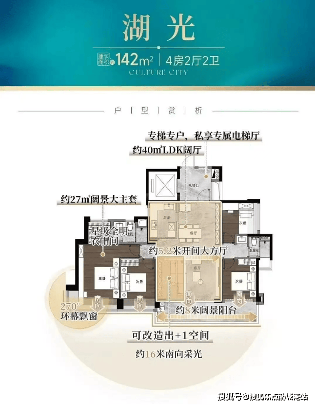 142㎡四房:8米全景阳台直面1.2万㎡湖景;