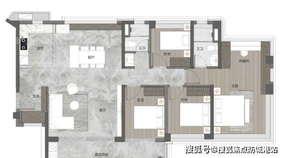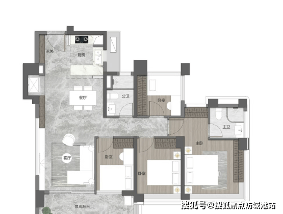 建面约119㎡四房:南北通透,设独立入户玄关与步入式主卧套房,功能分区清晰,实用性与舒适度兼备。