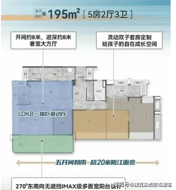 建面约160㎡/195㎡大平层:高区专属,五开间朝南,LDK一体化设计,195㎡户型阳台长达8米,两侧观江面合计约16米,堪比江景酒店套房。