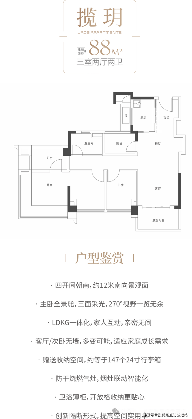 建面约 88 平方米的三房两厅两卫户型,是项目的主力刚需户型,采用三开间朝南设计,南向面宽约 9.6 米。客厅面宽约 3.6 米,连接约 6 米长的跑道式阳台,拓展了活动空间。户型动静分区合理,主卧套房设计,配备独立卫生间和衣帽间,保障居住私密性。创新的收纳设计,打造全屋无死角收纳空间,满足家庭全周期居住需求。该户型总价适中,是首次置业和刚需改善家庭的理想选择。