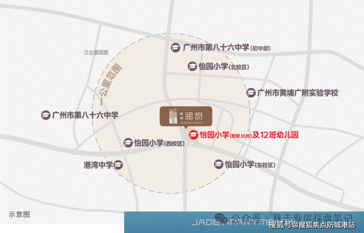 教育配套是项目的核心优势之一,项目已正式签约怡园小学北校区,配建 36 班小学,将由怡园小学派出核心管理团队和骨干教师进行高质量办学管理。怡园小学是黄埔区第一梯队公办小学,拥有深厚的办学底蕴和优质的教学质量,深受家长认可。项目同时配建 12 班幼儿园,实现从幼儿园到小学的目送式教育,彻底解决家长接送孩子的烦恼。周边 2 公里范围内还有黄埔广附实验学校、广州市第八十六中学等优质中学,形成完善的黄金教育链路。