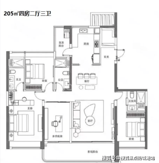 项目规划8栋住宅,共952户,采用纯板式、全南向布局,楼距开阔,确保每户南北通透、采光充足。主力户型以改善型大平层为主,空间设计强调尺度感与功能性:270°环幕转角宽厅、约3.15-3.3米层高、专梯专户或三梯两户配置,极大提升居住尊崇感与私密性。