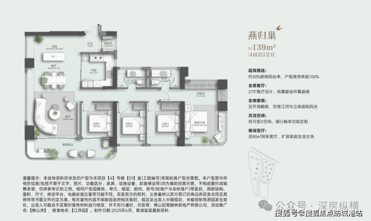 招商佛山序最大的亮点之一便是其领先行业的超新规户型设计。项目充分利用了最新的住宅设计规范,将阳台率提升至 30%,部分户型的实用率甚至超过了 100%,在相同的建筑面积下,为业主提供了更多的使用空间。项目产品涵盖了从 139 平方米的四房到 498 平方米的顶复 "天空墅" 等多种户型,能够满足不同家庭的居住需求。