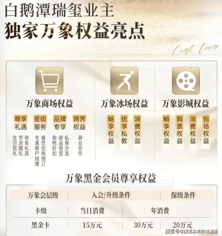 会员权益:瑞玺业主直接获得万象城黑金卡会员资格(普通消费者需年消费30万以上),享受专属停车位、VIP观影、新品预览、私宴预订等特权。