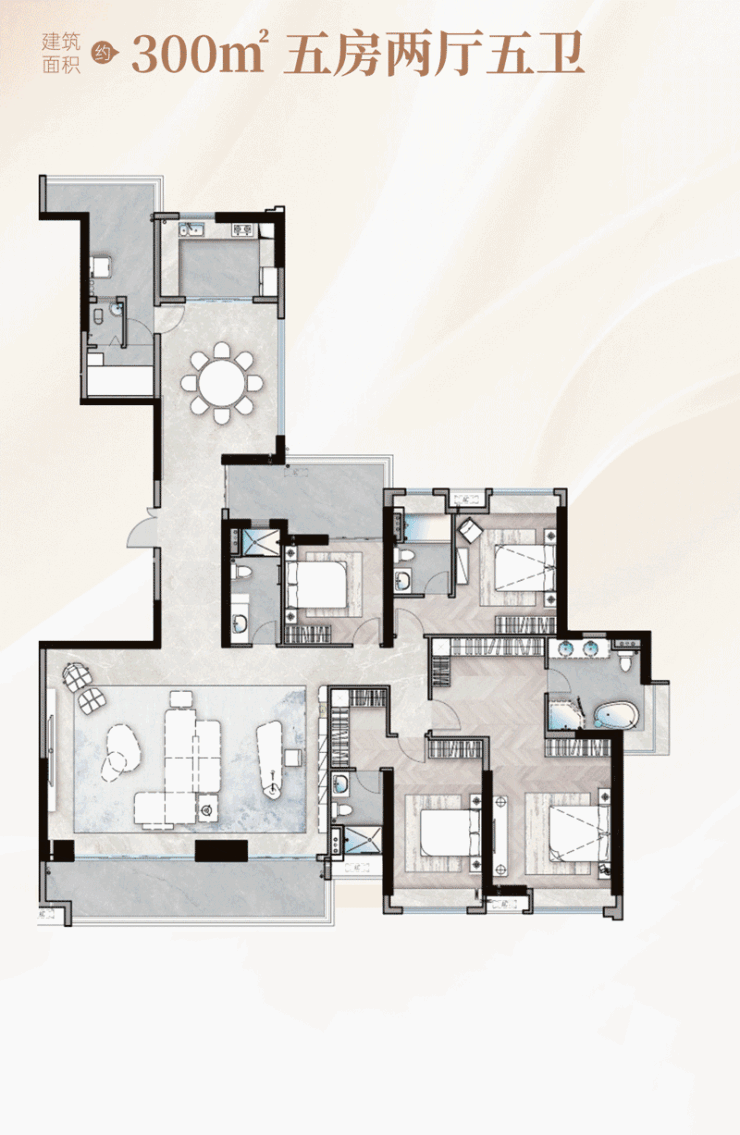 首先是户型的整体布局,这个户型采用了经典的大平层动静分区设计,动区的客厅、餐厅、厨房、阳台集中在户型的南侧与中部,形成了一个超大尺度的公共活动空间,静区的四个卧室与三个卫生间分布在户型的两侧,形成了双套间 + 独立次卧的布局,日常的居家活动、社交待客完全不会影响到卧室区域的休息,保障了居住的私密性与舒适度,同时整个户型采用了五开间朝南的设计,客厅与四个卧室中的三个都朝向南侧,南向的总采光面非常宽,整个室内的每一个空间都能获得充足的日照时长,采光效果非常优异。
