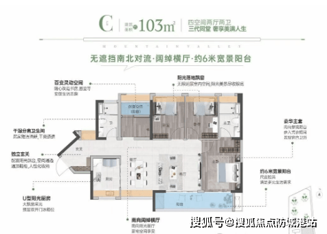 103㎡ 4房2厅2卫:南北通透,超6米宽MAX宽景阳台,气派U型厨房。