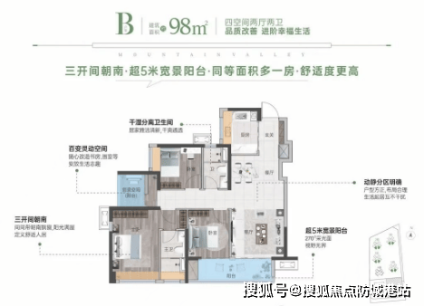 98㎡ 4房2厅2卫:超5米宽阳台,户户朝南,通风采光极佳。
