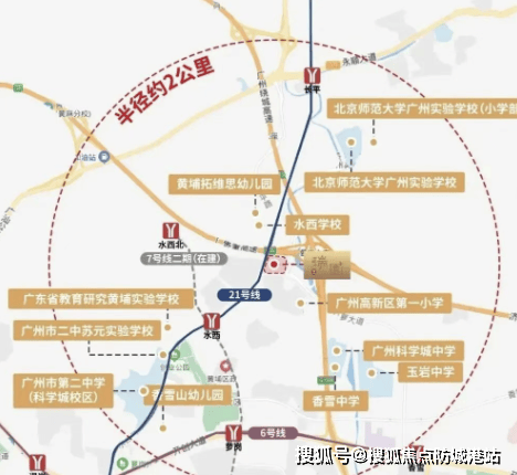 A: 根据官方数据,项目位于广州市黄埔区科学城区府板块,与科城山庄一路之隔。距地铁21号线/7号线水西站约1公里,有轨电车1号线无缝接驳。驾车前往珠江新城约25分钟。