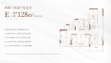 建面约 128㎡ 4+1 房两厅两卫:终极改善款,四开间朝南,客厅连接超 7 米长景观阳台,无遮挡俯瞰社区水景或园林;N+1 拓展空间可改造为私人影院或茶室,实现 “四房变五房”;独立入户玄关保障隐私,LDKB 一体化布局(客厅 + 餐厅 + 厨房 + 阳台联动),公共空间开阔;主卧套间配备独立卫浴(双台盆 + 浴缸)与 270° 观景飘窗,次卧空间均匀,四房设计可满足三代同堂需求;低密小高层稀缺户型,适合对 “空间尺度 + 低密品质” 有需求的改善家庭,长期居住与资产保值能力双优。