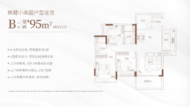 建面约 95㎡ 3+1 房两厅两卫:刚需入门首选,全南向设计,客厅连接观景阳台,部分房源享社区园林景观;N+1 拓展空间可改造为书房或儿童房,实现 “三房变四房”;主卧配备独立卫浴与观景飘窗,保障主人隐私;餐客厨一体化设计,功能分区明确;低密小高层布局,采光通风俱佳,适合年轻通勤家庭,低总价即可享受 “万博旁 + 地铁 + 低密”,性价比拉满。