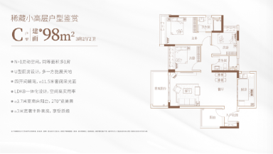 建面约 98㎡ 3+1 房两厅两卫:改善主力户型,南北通透,客厅连接大面宽阳台,部分房源享水景景观;N+1 拓展空间灵活度高,可作为家庭活动室或储物间;主卧套间面积充足,配备独立卫浴与步入式衣帽间(预留空间);低密 9-11 层设计,楼间距宽,视野无遮挡,适合二孩家庭或对 “低密居住” 有需求的改善群体,是项目 “销量主力款”。